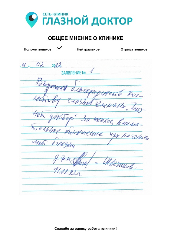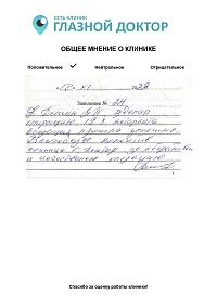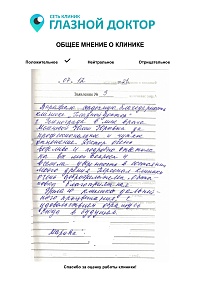 сотрудников о пациентах. Это очень дорогого стоит. Желаю коллективу клиники «Глазной доктор» здоровья,