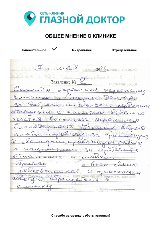 Большое спасибо за проведенную операцию, обслуживание отличное.