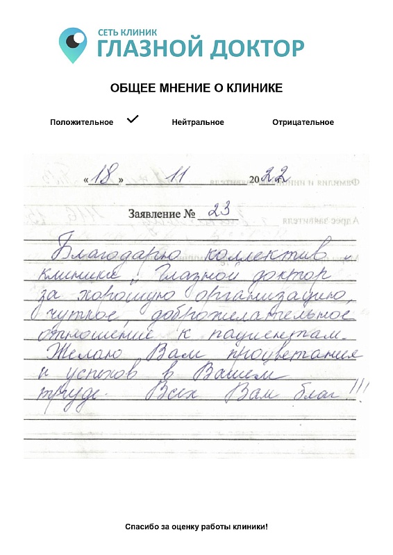 Благодарю коллектив клиники «Глазной доктор» за хорошую организацию, чуткое и доброжелательное отношение к пациентам. Желаю вам процветания и успехов в вашем труде. Всех вам благ!