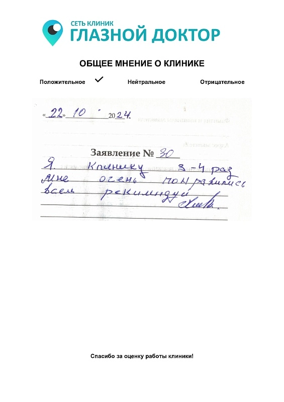 сотрудников о пациентах. Это очень дорогого стоит. Желаю коллективу клиники «Глазной доктор» здоровья,