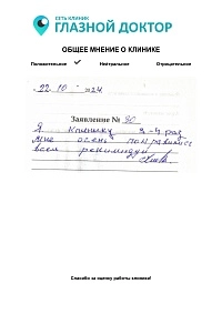 Пожалуйста, оставьте свой отзыв о лечении в клинике «Глазной Доктор». Это очень ценно для нас! Всего несколько слов о качестве, сервисе и результате.