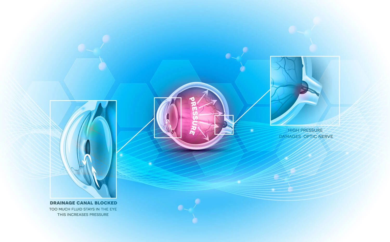 Высокое внутриглазное давление воздействует на зрительный нерв, берущий начало в заднем полюсе глаза. Механическое воздействие на нерв, нарушение кровоснабжения и обменных процессов запускают его атрофию (постепенное умирание).