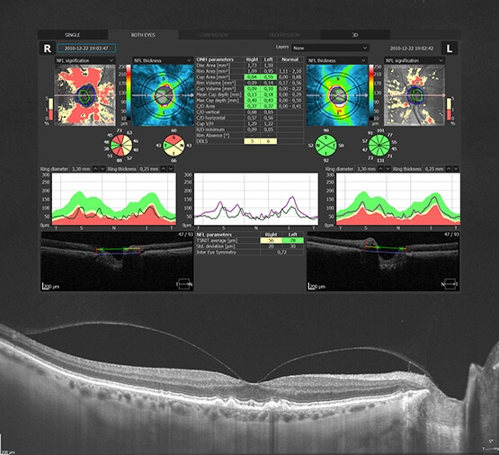 Современные томографы имеют множество режимов работы, предназначенных для обследования каждой структуры глаза. Полученные данные можно сравнить как с другим глазом, так и с обширной нормативной базой для получения максимально достоверной информации.